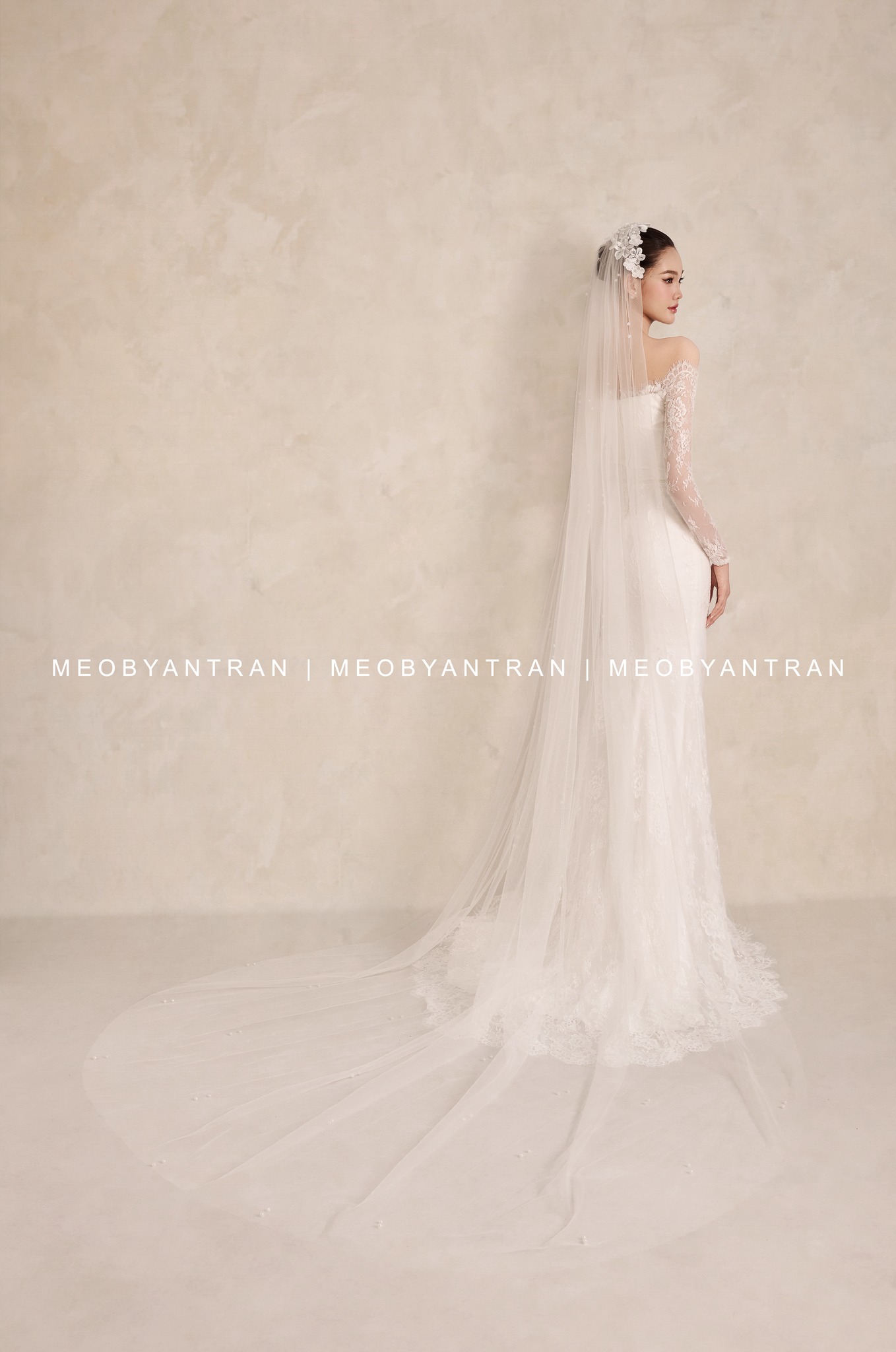 Áo cưới ren tay dài trễ vai đẹp cho cô dâu đi bàn #1150