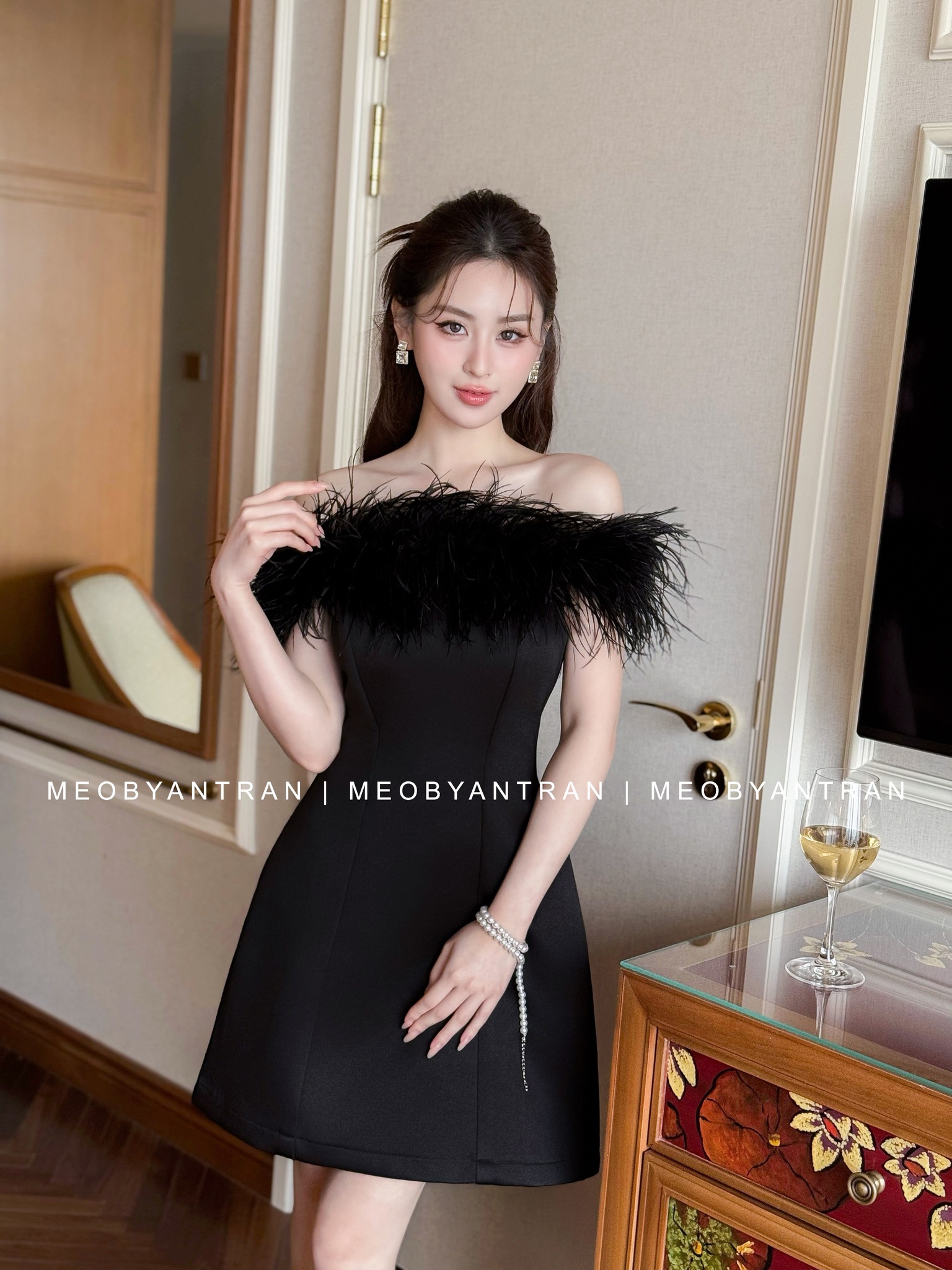 Đầm xoè lông vũ vai ngang NGẮN #3070